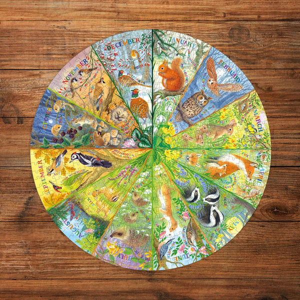Take a journey through the seasons in the forest with this 500-piece circular puzzle. Each section contains plants and animals you might spot on a visit to the woods during each month of the year. From springtime blooms to winter wildlife, this beautifully illustrated scene celebrates the changing rhythms of nature in our woodlands. The National Trust looks after special places, so people and nature can thrive. Through sales generated from the National Trust x Gibsons collection, a minimum of £5,000 will be given to the National Trust to help look after nature, beauty and history, for everyone, for ever. This beautiful 500-piece circular jigsaw puzzle has been painted by the talented artist Claire Comerford. High quality finish 500 piece jigsaw puzzle for adults and older teens Included in the box is a handy print of your puzzle Made in the UK & Europe from 100% recycled, durable cardboard Completed puzzle size: 49 cm | 19 inch diameter Packed in paper bags A mindful and relaxing activity for solo puzzlers.