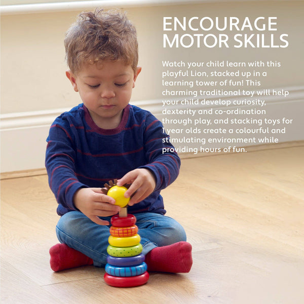 This traditional wooden stacking ring is the perfect toy for toddlers. Hand painted rings in bright colours with a lions head to finish it off! Perfect for little hands and to help develop coordination skills.